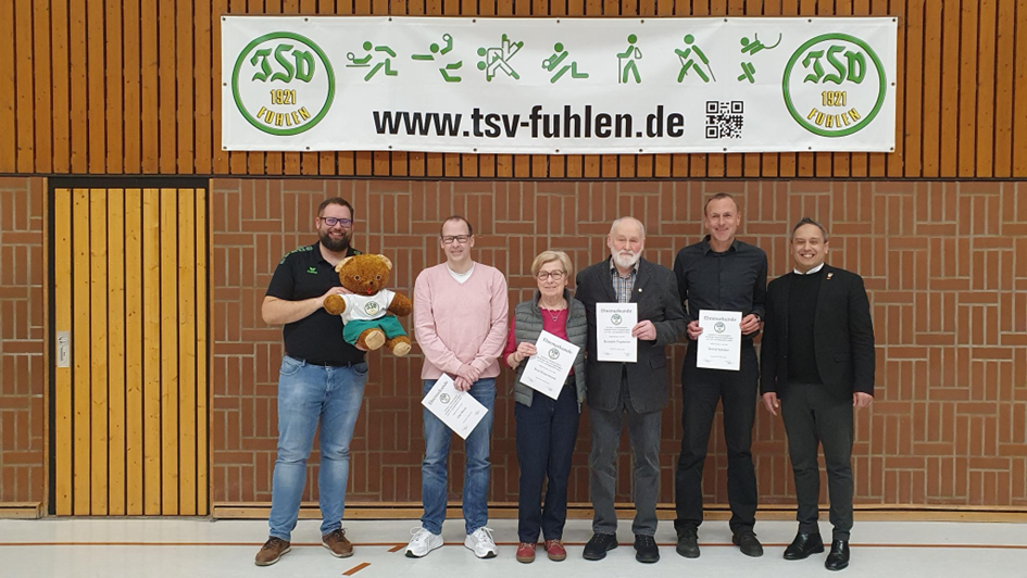 Die Jubilare auf der JHV des TSV Fuhlen e.V. (v.l. Boris Meyer 1. Vorsitzender. Olaf Bruns, Rosi Watermann, Heinrich Tegtmeier, Bernd Schüler, Bürgermeister Tarik Oenelcin)